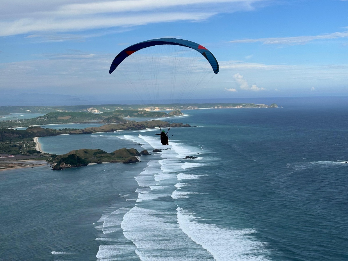 Tandem paragliding in Kuta, Lombok is an adventure activity where visitors can fly using a parachute (paraglider) together with a professional instructor. Flights usually start from hills around Kuta Beach, such as Merese Hill, offering beautiful views of the ocean, white sandy beaches, and the green hills of Lombok. This activity is safe for beginners, as it is done with experienced instructors.